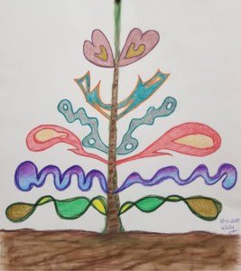 Het symmetrische tekenen bevordert het midden beleven, het ‘in je as’ staan. Vanuit die plek maak je keuzes, reageer je of niet, bepaal je jouw richting. Je laat je niet afleiden, meeslepen, wegzuigen, overhalen. Want je kunt in jouw midden blijven, in jouw as blijven staan.